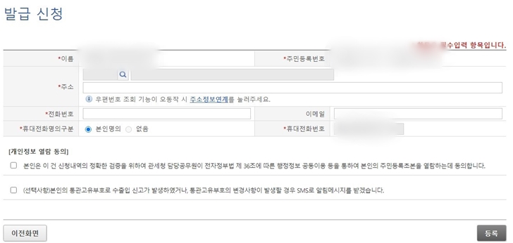 발급 신청 페이지에서 자신의 이름 / 주민등록번호 / 주소 / 전화번호 / 이메일 / 휴대전화번를 입력하고 휴대전화 명의도 체크를 해야합니다. 모든 정보들을 입력하고 (이메일은 필수가 아님) 동의에 체크 한 뒤에 "등록" 버튼을 누르면 정상적으로 등록됩니다.