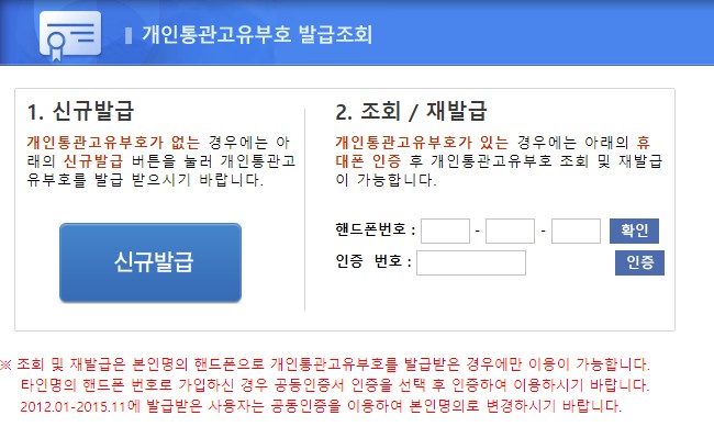 해외직구를 위하여 처음 발급 받는 사람은 1번 신규 발급을 선택하면됩니다. 혹시 발급 받았는지 아리까리하면 2번의 조회/재발급을 선택하여 핸드폰 번호를 입력한 뒤 인증을 받으면됩니다.
