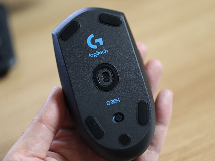 로지텍 무선마우서 G304의 바닥에는 4개의 고무패드와 센서 그리고 전원 스위치가 있습니다. 사용을 하지 않을 때에는 전원을 꺼두는게 배터리 사용에 좋겠죠.