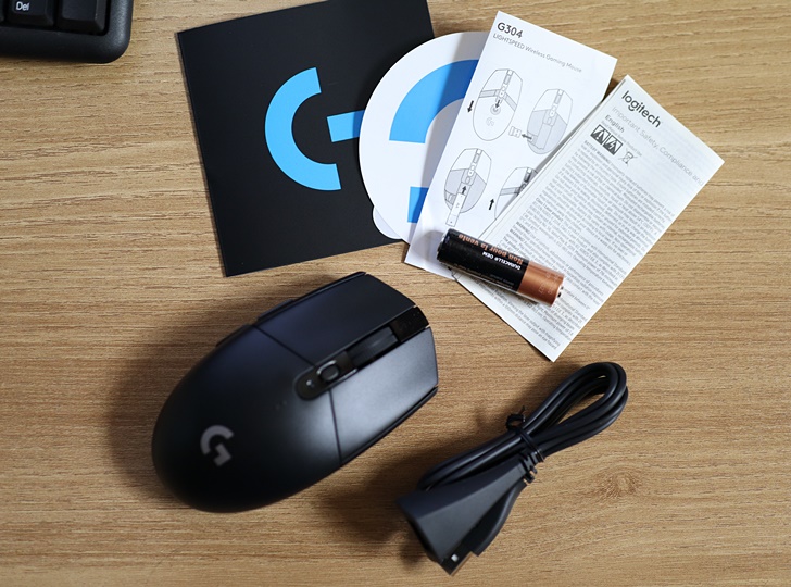 구성품은 "로지텍 G304 무선마우스 / AA건전지 / 설명서 / 스티커? / USB 연장 케이블"입니다. 건전지를 주는게 좋네요. 가끔 건전지 없는 무선마우스 건전지 찾니라 당황한 기억이 있어서요. (USB 연장케이블은 마우스와 수신기 거리가 멀어지면 끊김이 발생할 수 있거나 문제가 있을 수 있습니다. 그럴때 연장 선을 컴퓨터에 장착하고 마우스와 가까운 거리에 놓고 연장선 끝부분에 수신기를 장착하는 용도입니다.)