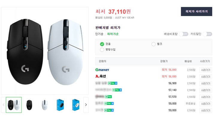 다만 국내 정품 로지텍 G304의 경우는 행사로 3만원 중반의 가격대로 자주 풀립니다. (그래서 사람들이 대부분 정가를 3.5만원 정도로 생각하고 있다는 소문도) 저도 이번에 롯데온에서 34,000원대의 가격으로 풀린 정품을 구매했습니다.