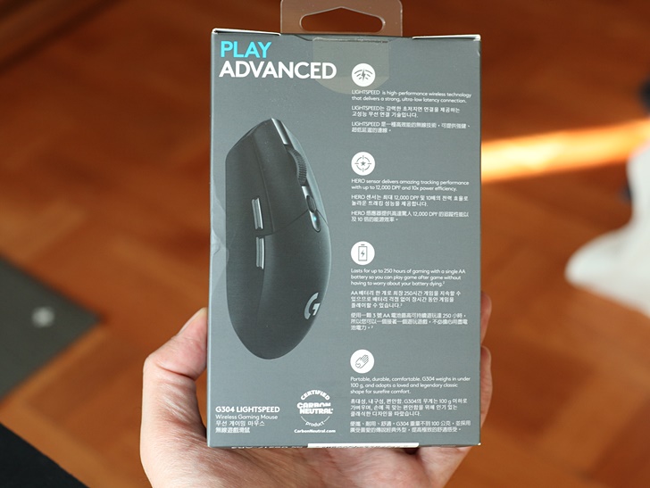 뒷면에는 뭐 LightSpeed 기술로 안정적인 무선 연결을 지원한다는 내용과 옵티컬 HERO 센서로 탁월한 정확도와 응답성을 그리고 게이밍용 성능으로는 최대 250시간 / 전력 효율 모드로는 최대 9개월 사용이 가능하다고 합니다. 또 한국인에 맞는(?) 그립감을 제공한다는 내용까지!