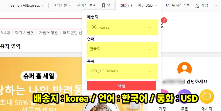 알리에서 직구 물건 주문하기 앞서서 메인 화면서 우측 상단에 위치한 옵션을 선택해서 "배송지 : korea / 언어는 한국어 / 통화는 USD"로 선택하고 저장하기를 눌러줍니다. 그러면 영어로 보이던 쇼핑몰이 한국어로 번역된 상태로 바뀝니다. 이제 쇼핑을 시작해보죠~!