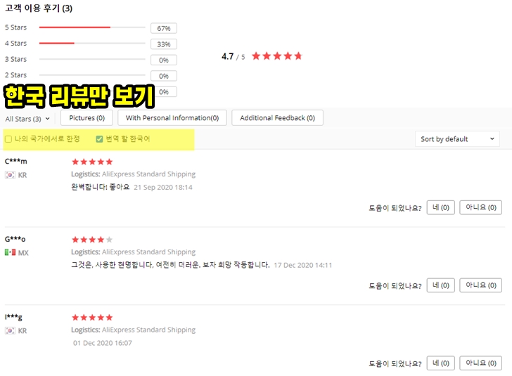 제품 설명도 읽어보고 하단으로 쭉 내려오면 "고객 이용 후기"가 있습니다. 판매자를 신뢰할 수 없는 상황에서는 고객들의 리뷰나 별점이 가장 큰 도움을 줍니다. 제가 구매하려는 판매자는 리뷰가 많지는 않은데 한국 사람 두 분이 모두 별 5개를 줬습니다. 뭔가 신뢰가 +1 된 느낌이라 해당 판매자의 물품을 구매합니다. (체크하면 한국의 리뷰만 볼 수 있습니다.)