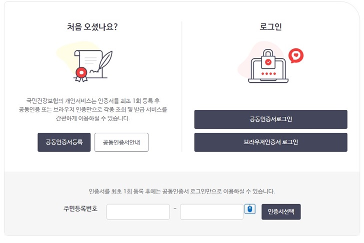 국민건강보험 홈페이지를 처음 이용하는 방문자라면 "공인인증서 (공동인증서)"를 국민건강보험 홈페이지에 등록을 해야합니다. 처음 1회만 등록하고 그 뒤로는 해당 공동(공인)인증서로 로그인 가능합니다.