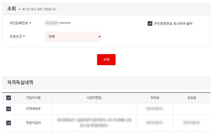 메인화면에서 "자격득실 확인서 발급"을 다시 선택하면 건강보험자격득실을 조회하는 페이지가 나타납니다. 상단의 조회 조건에서 옵션을 선택할 수 있으며 주민등록번호를 모두 표시인지 아니면 부분표시인지 선택할 수 있습니다.