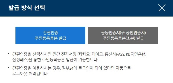 발급 방식을 선택해야합니다. 본인임을 증명해야지만 해당 서류를 발급 받을 수 있겠죠. 간편인증은 민간 전자서명을 통해서 발급이 가능하고 공인인증서(지금은 공동인증서)가 있다면 오른쪽의 "공동인증서"로 발급이 가능합니다. 저는 공동인증서가 있어서 오른쪽 메뉴를 선택했습니다.