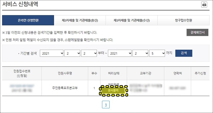 처리상태의 "문서출력" 버튼을 누르면 해당 민원 즉 주민등록초본을 출력할 수 있습니다.