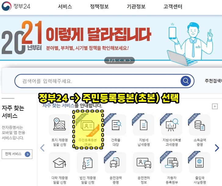 가끔 주민등록초본이 필요한 경우가 있습니다. 간단하게 발급 받는 방법은 가까운 "주민센터" 방문해서 현장에서 발급 받는 방법이 있지만 가는 길도 귀찮고 주민센터에서 발급 받는 경우에는 수수료 1통에 400원이 발생합니다.