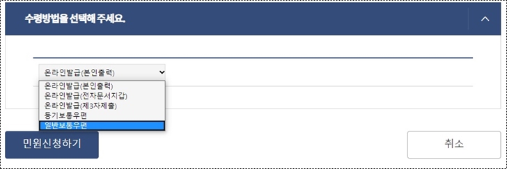 마지막으로 수령 방법을 선택하는데 온라인발급 (본인출력)으로 발급받았습니다. 3자 제출은 제출하려는 기관으로 바로 보내주는듯하고 등기우편이나 일반 우편으로도 받아볼 수 있습니다. 선택하고 "민원신청하기"를 눌러 진행했습니다.