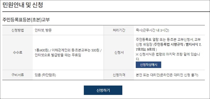 민원 안내 페이지로 이동합니다. 인터넷의 경우는 수수료가 무료이고 방문 발급은 1통에 400원 / 이해관계인의 등초본교부는 500원으로 100원 더 비싸네요. 인터넷은 신청즉시 처리됩니다. 하단의 "신청하기" 버튼을 누르세요.