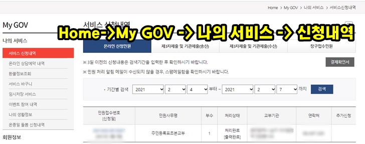 그리고 정부24홈페이지의 "나의 서비스"에서 "서비스 신청내역"을 확인해보면 자신이 신청했던 민원 목록이 나타납니다.