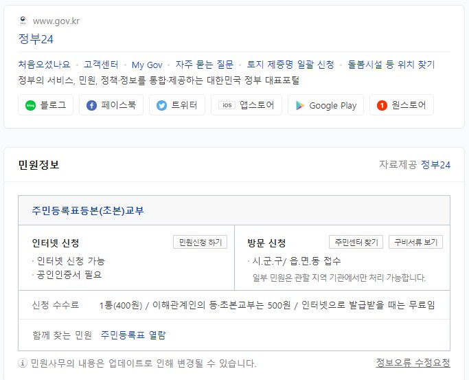위의 링크를 눌러 이동하거나 네이버나 다음에서 "정부24"를 검색하여 이동하면됩니다. 네이버의 경우에는 "주민등록초본"으로 검색하면 하단의 "민원정보"가 출력되고 "민원신청 하기"버튼을 통해서 바로 해당 메뉴로 이동이 가능합니다.