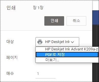 바로 인쇄를 해도 상관없는데 가끔 PDF 파일로 필요한 경우가 있을 수 있습니다. 그런 상황에서는 먼저 "인쇄" 버튼을 누르세요.
