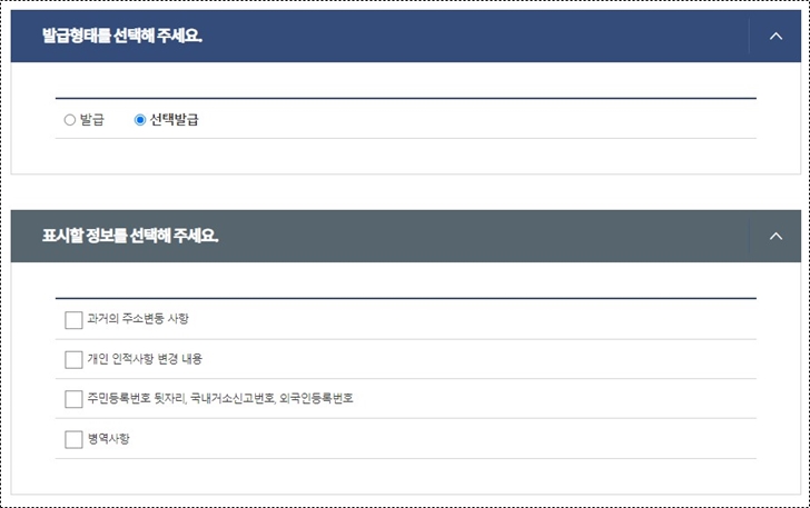 발급형태를 선택합니다. 과거의 주소변동 사항이나 개인 인적사항 주민등록번호 뒷자리 병역 사항등의 옵션을 선택해서 발급이 가능합니다. (과거의 주소변동이 필요한 주민등록초본인데 이를 빼놓고 발급받으면 의미가 없겠죠.)
