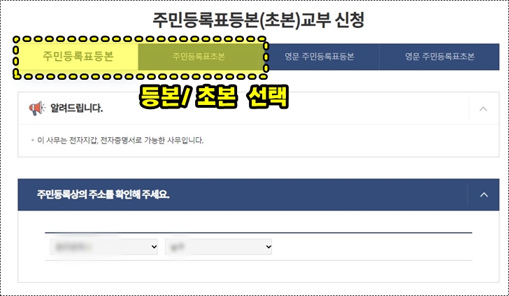 주민등록등본과 초본은 같인 페이지에서 신청합니다. 주민등록표등본을 원하면 상단 탭에서 "주민등료등본"을 선택하고 초본을 원하면 그 옆의 "주민등록표초본"을 선택합니다. 그리고 하단의 주민등록상의 주소를 선택하세요.