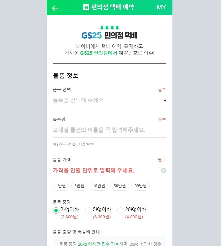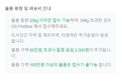 중량과 배송비 부분인데 네이버에서 예약하는 GS25 택배의 경우는 물품 중량 20kg까지만 접수가 가능합니다. 부피가 크거나 무게가 많이 나가는 택배품목은 다른 택배를 이용하거나 GS Postbox에서 접수할 수 있습니다.