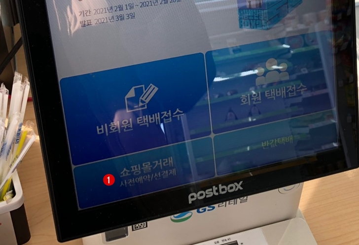 GS25의 경우 postbox 기기에서 하단에 위치한 "쇼핑몰 거래(사전예약/선결제)"를 선택합니다. 네이버에서 이미 예약하고 결제까지 끝낸 상태라서 다른 메뉴말고 요걸로 선택하세요.