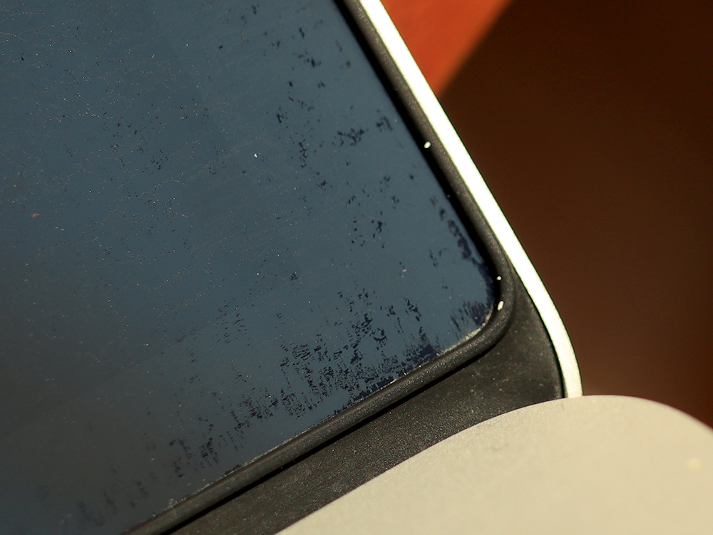 그리고 고질적인 문제점 중에 하나인 "스테인게이트" 현상이 있습니다. 처음에 받았을 당시에는 전체적으로 완전 심하게 코팅이 벗겨진 상태라서 화면이 꺼진 상황에서는 답이 안나왔는데 물티슈로 벅벅 닦아서 중앙부분은 거의 제거를 했고 (기존에 맥북프로에 입혀진 코팅) 모서리 부분의 코팅들은 아직 남아 있습니다.