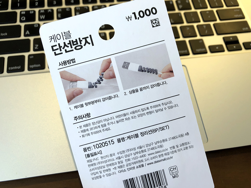 맥북의 충전 케이블은 특히나 단선이 잘됩니다. 길이가 길어서 그런지는 모르겠지만 감아서 사용하기도 하고 또는 충전기와 맥북을 연결했을 경우 과도하게 휘어지는 모양때문에 더 그런듯합니다. 그래서 케이블들의 단선을 방지하는 아이템들이 많이 나오는데 오늘은 다이소에서 판매하는 :케이블 단선방지 제품을 구매해서 잠깐 사용해봤습니다. 가격은 역시 다이소 판매 가격은 1,000원 입니다.