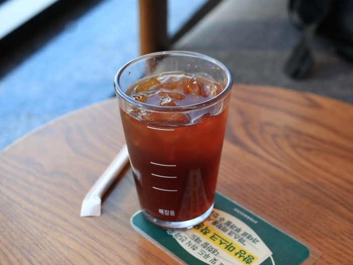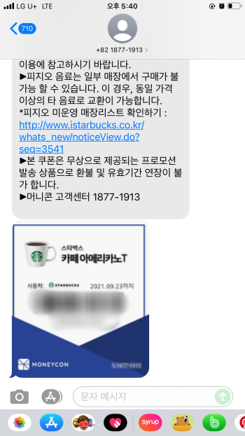 신청한 멤버십 쿠폰은 문자로 전송됩니다. 스타벅스 카페 아리카노 톨사이즈 쿠폰이 문자로 도착했고 바코드가 담긴 기프트콘 방식의 이미지를 매장에서 보여주거나 스벅 사이렌오더에서 등록해서 이용이 가능합니다. 더운날 시원하게 아이스로 주문했습니다.