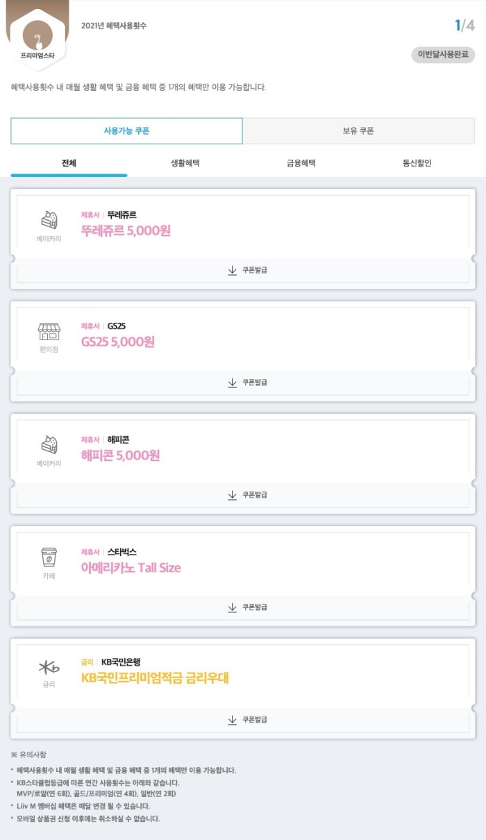 다른 멤버십처럼 어디 몇프로 할인이 아니라 금액권 쿠폰을 제공합니다. 뚜레쥬르 5,000원 / 해피콘 5,000원 / GS25 5,000원 / 스타벅스 톨사이즈 아메리카노 (4,100원) / KB국민프리미엄적금 금리우대 이렇게 5개 종류의 쿠폰인데 스벅이 금액으로 따지면 제일 저렴하네요. 그래도 다른 매장들은 이용을 잘 안해서 스벅으로 골라서 마셨습니다.