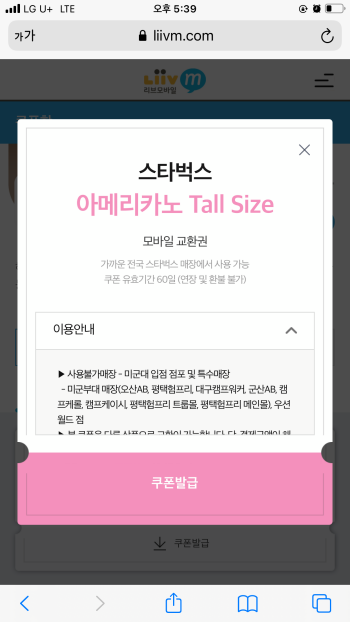 방법은 리브엠 모바일 홈페이지 접속해서 로그인 한 뒤에 "멤버쉽"->"쿠폰함"에서 원하는 쿠폰을 선택해서 "쿠폰발급"을 진행합니다. 저는 스타벅스 아메리카노 마시려고 스벅 쿠폰으로 선택해서 발급받았습니다. 주의사항 잘 읽어보시고요. 쿠폰의 유효기간은 60일입니다.