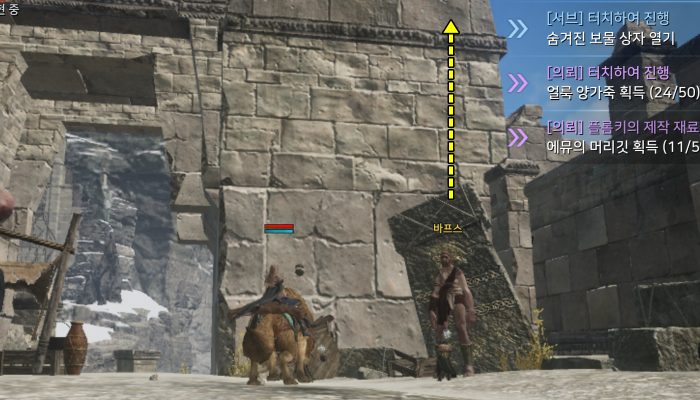 마을에 위치한 바프스 엔피씨 뒤의 성벽을 올라타서 정상에 위치한 보물상자를 획득해야합니다. 성벽만 계속 올라가면됩니다.