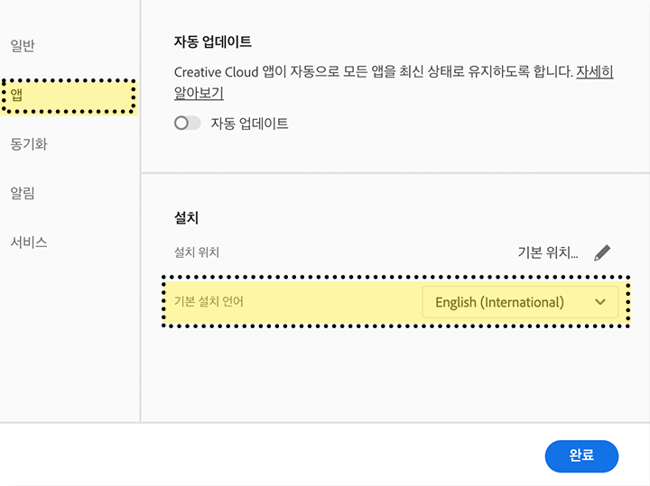 "환경 설정 -> 앱 -> 설치 -> 기본 설치 언어를 한국어에서 다른 언어로 변경 "