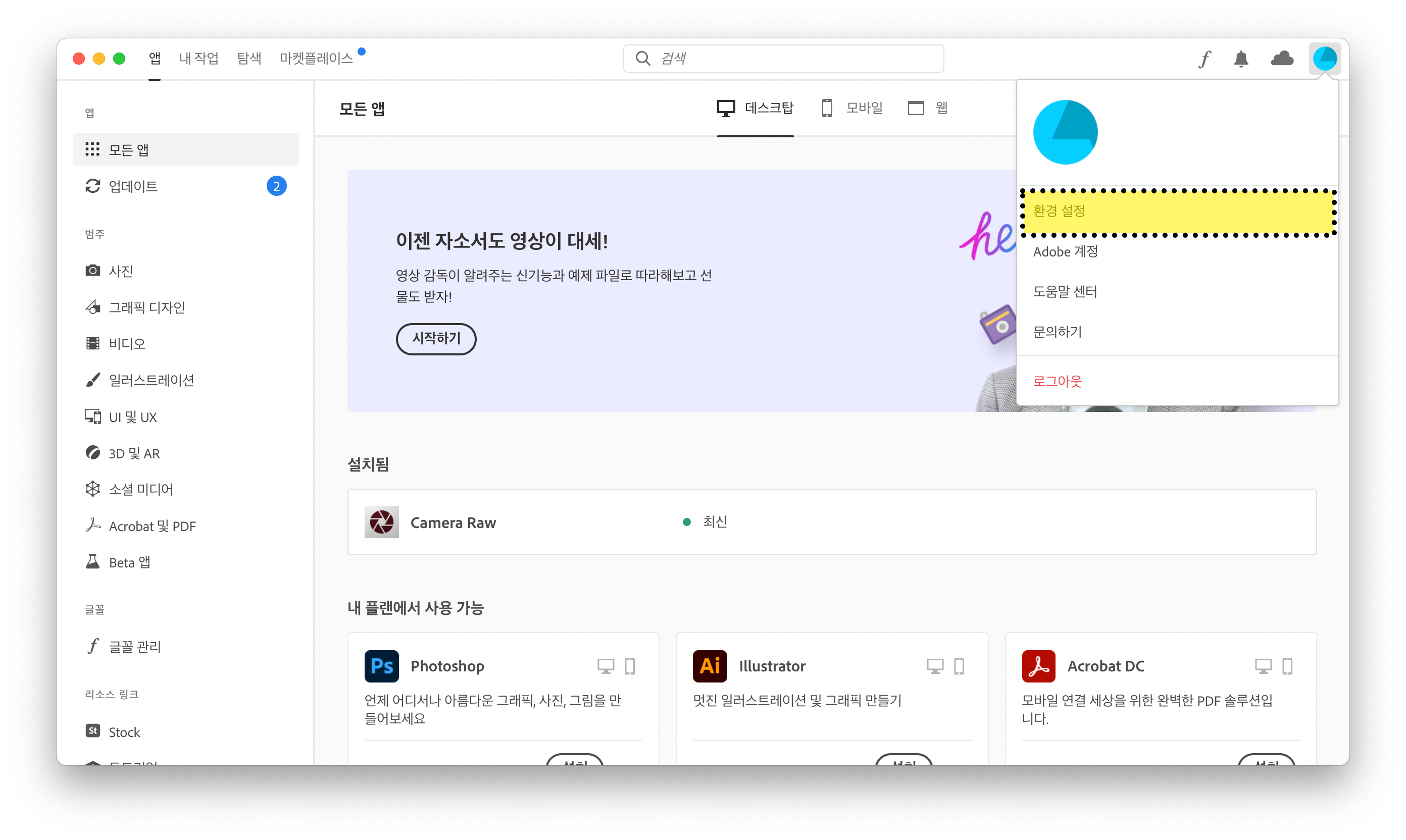 어도비 크리에이트비 클라우드 (adobe creative cloud) 앱에서 우측 상단의 설정 아이콘을 눌러 "환경 설정" 메뉴를 선택합니다. 설치된 프리미어에서 영문으로 바꾸는 방법도 있지만 새롭게 설치하는걸 추천드립니다. (설치 시간이 걸릴 뿐이지 훨씬 쉽거든요.)