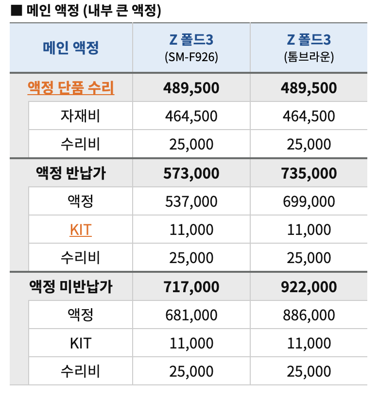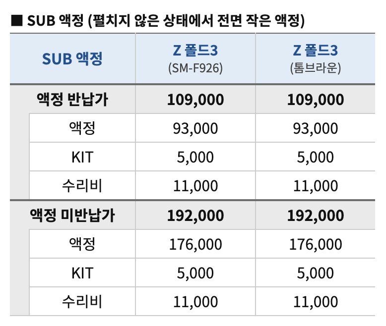 폴드는 액정이 1개가 아니라 외부의 서브 액정이 추가로 존재합니다. 서브액정은 단품만 수리하는 방식은 없고 액정을 반납하는 경우 109,000원이고 액정 미반납은 192,000원 으로 폴드와 톰브라운 모두 동일합니다.