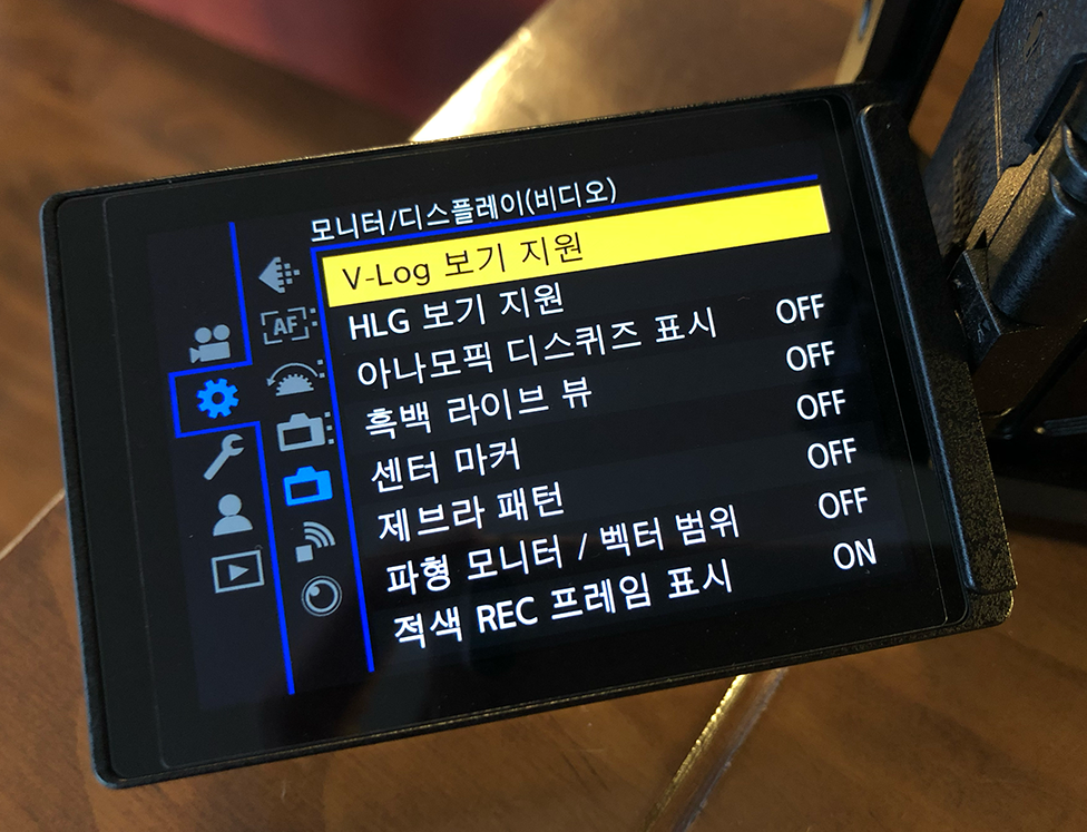 파나소닉 s5 카메라의 menu/set 버튼을 누릅니다. 액정 화면에서 톱니바퀴 모양의 설정 - 모니터/디스플레이(비디오) 메뉴로 이동하여 "V-log 보기 지원" 항목을 선택합니다.