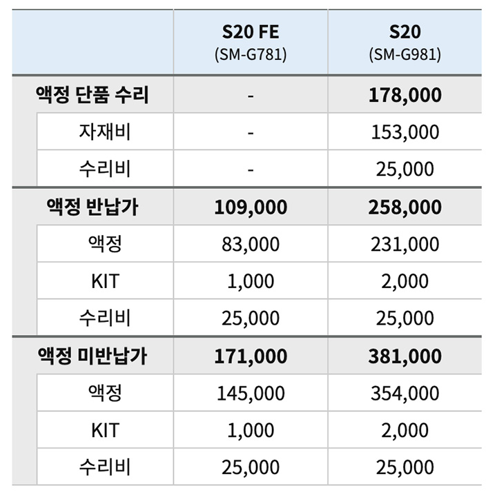 s20 FE (SM-G781) 모델의 경우는 액정을 미반납할 경우 171,000원 액정 반납의 경우에는 109,000원
