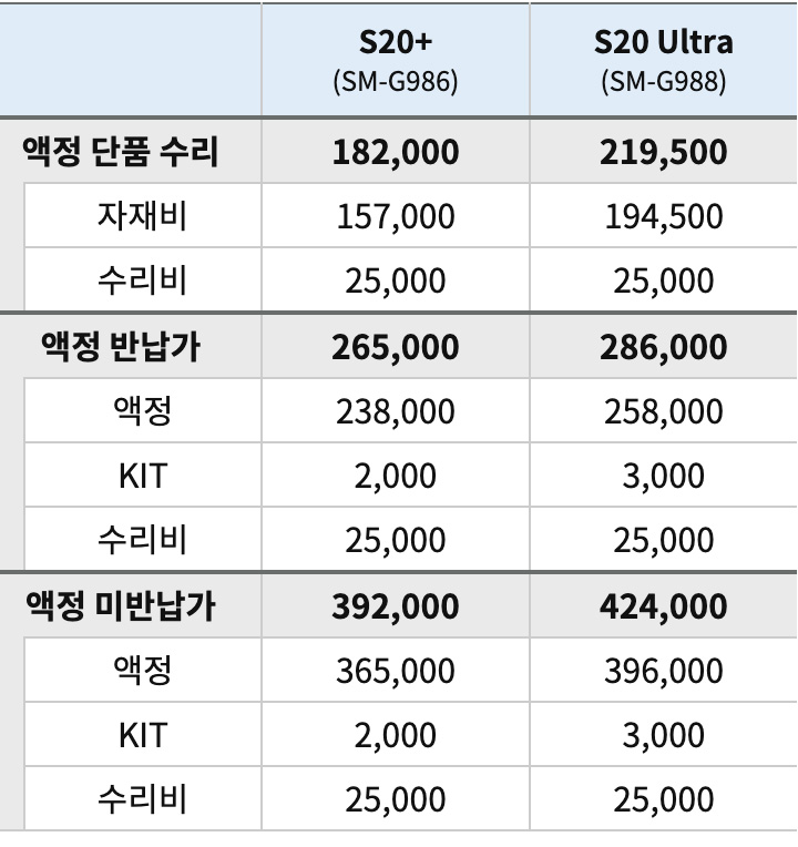 s20플러스 (SM-G986) 액정 단품의 수리 비용은 182,00원 액정 교체시 미반납은 392,00원 반납은 265,000원입니다.