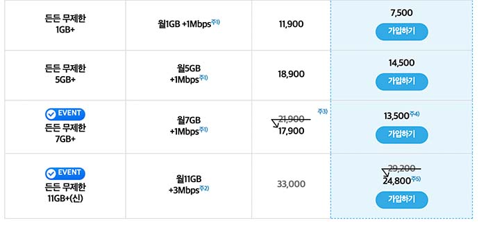 - 해당 요금은 이벤트로 진행되는 요금제로 매월 금액이 다를 수 있습니다. 홈페이지에서 매월 이벤트를 확인하시면 좋습니다.