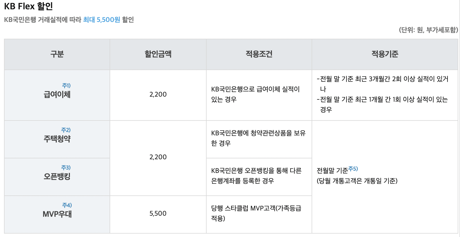 국민은행에서 운영하는 알뜰폰이라 국민은행과의 거래가 있으면 할인되는 부분들이 있습니다. 국민은행으로 급여를 이체하는 경우에는 2,200원 주택청약이나 오픈뱅킹을 이용중이면 또 2,200원이 할인됩니다. (주택청약과 오픈뱅킹 할인 중복 적용 불가 ) 이런 조건이 갖춰지면 총 4,400원의 할인을 받기에 35,400 원으로 플렉스 LTE 요금제를 이용할 수 있습니다.