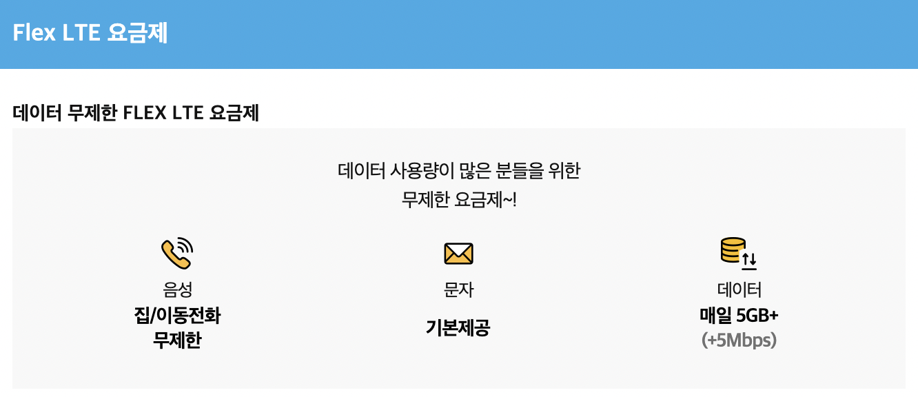리브엠 모바일의 플렉스 요금제는 음성과 문자는 기본제공으로 무제한이며 데이터의 기본 제공량 없이 매일 5GB의 데이터를 제공합니다. 든든 요금제는 11GB의 기본 데이터에 매일 2GB였는데(30일 기준 120GB) 플렉스 요금제는 기본제공량이이 없이 매일 5GB니까 30일로 계산하면 총 150GB의 데이터를 이용할 수 있습니다. (데이터 쉐어링 매월 11GB 별도 제공)