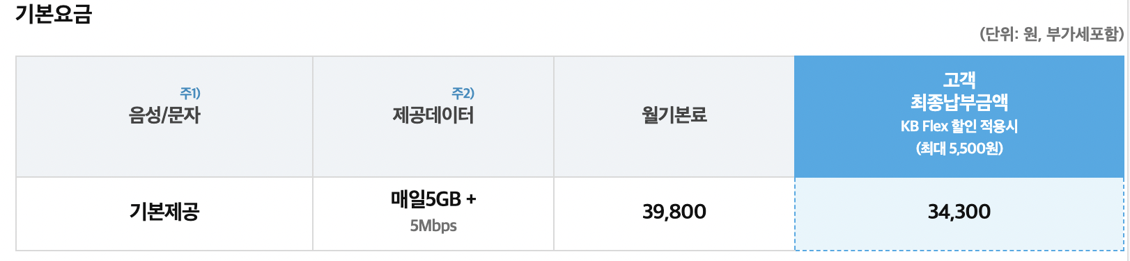 월 기본료가 39,800원인 플렉스 요금제인데 이벤트 할인으로 -9,900원 할인이 들어갑니다. 주의할 부분으로는 앞에서 소개한 KB Flex 할인과는 중복적용이 불가능합니다. 그래도 이런저런 조건 없이 9,900원 할인이라 가입만하면 24개월동안 39,800원 요금제를 29,900원에 이용이 가능합니다.