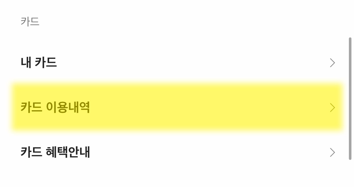 2. 설정에서 쭈욱 내려보면 "카드" 카테고리에서 "카드 이용내역"을 선택합니다.