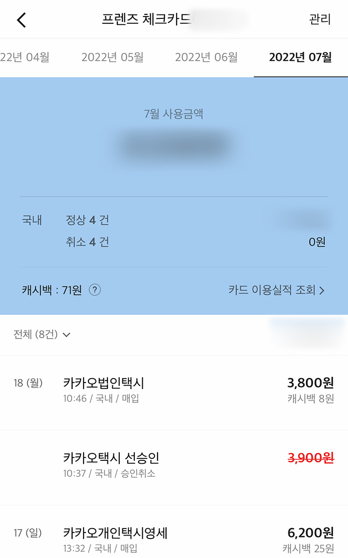 3. 월별로 카드 사용금액과 사용 내역들이 리스트로 출력됩니다. 날짜와 어디서 카드를 사용했는지 나오니깐 확인하기는 편리합니다. 저는 주로 카카오택시 이용하면서 썼네요. 다만 이건 제가 확인하는 용도고 제출을 해야하는 경우라면 카카오뱅크 카드 이용내역을 엑셀 파일로 받을 수 있습니다.
