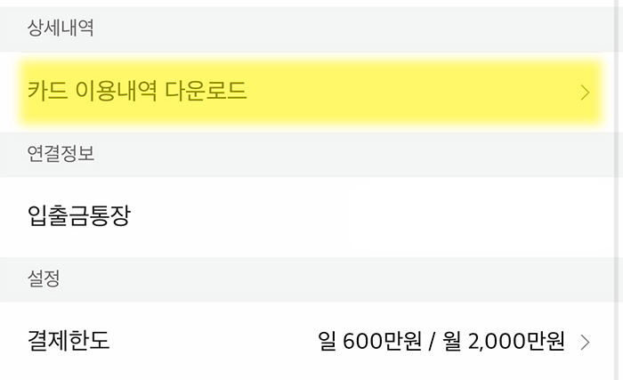 3. 카카오뱅크 앱의 카드관리에서 중간쯤에 위치한 "상세내역" 탭에서 "카드 이용내역 다운로드"를 선택해주세요.