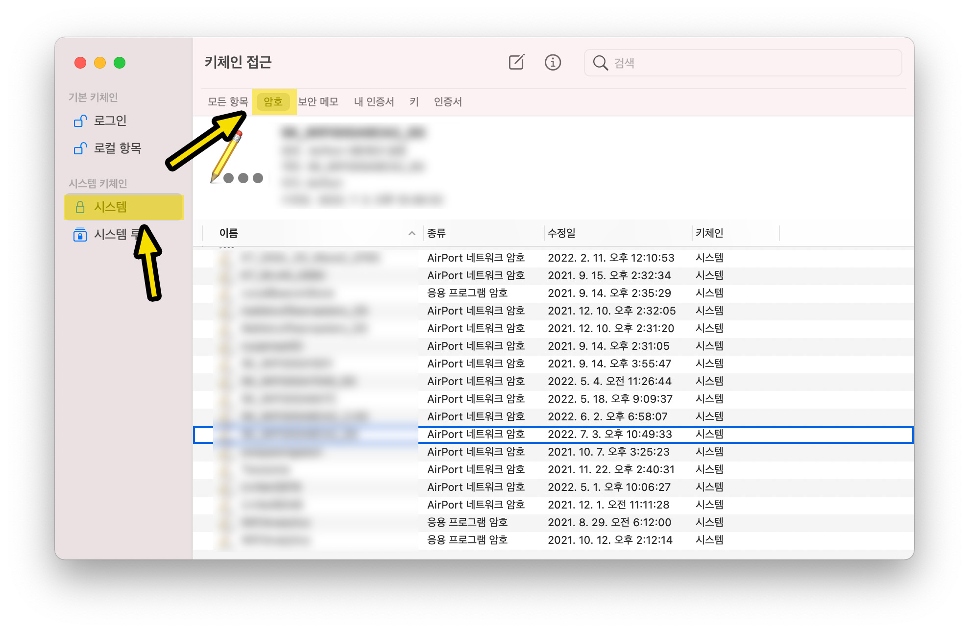 3. 키체인에서 좌측 탭에서 "시스템" 그리고 우측의 "암호"를 선택하면 접속했던 와이파이들의 목록이 촤르르륵 보여집니다. 여기서에서 궁금했던 와이파이 이름을 선택합니다.