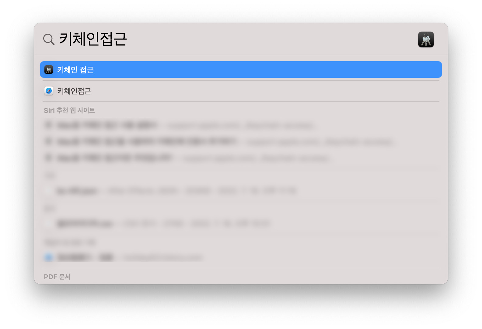 1. 오른쪽 상단의 돋보기(spotlight) "키체인 접근"을 검색합니다.