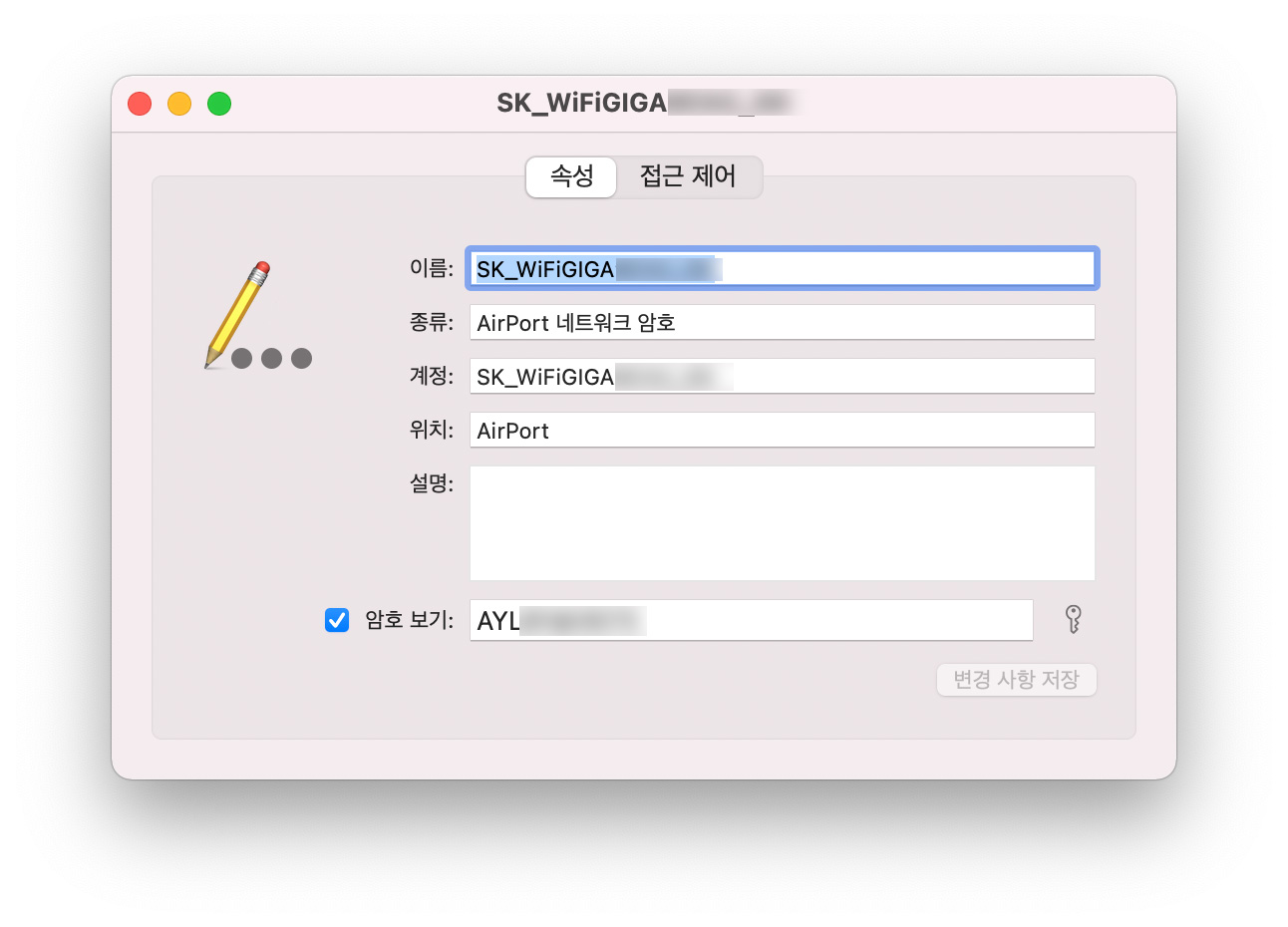 5. 하단의 이미지처럼 선택한 와이파이의 정보가 출력되는데 이름 종류 계정 위치 설명 그리고 암호보기가 있습니다. 암호 보기에 체크를 하면 맥북의 비밀번호를 입력해서 인증하는 단계를 거치고 한번 접속했던 와이파이 무선인터넷의 비밀번호가 보여집니다. 이제 이 비밀번호를 가지고 티비나 다른 인터넷을 이용하는 기기에서 wifi를 접속하면되는거죠.