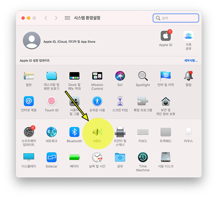 2. 맥북의 시스템 환결설정으로 이동합니다. 그리고 "사운드" 스피커 모양을 선택하세요.