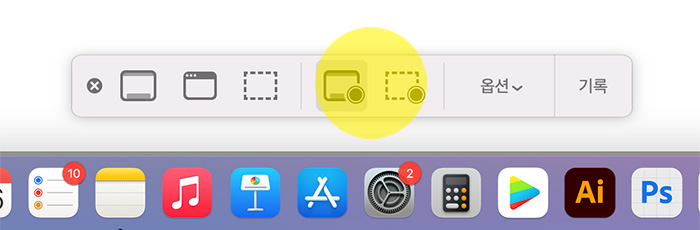 1.맥북에서 "command + shift + 5 " 단축키를 누르면 하단의 이미지처럼 캡쳐나 녹화 옵셔이 나타납니다. 왼쪽의 아이콘들은 캡쳐 관련 아이콘이고 오른쪽에 표시된 부분이 화면녹화 아이콘입니다. 선명한 테두리는 맥북의 화면 전체를 기록하는 방식이고 그 옆의 점선은 영역을 선택해서 해당 부분만 녹화하는 방식입니다.