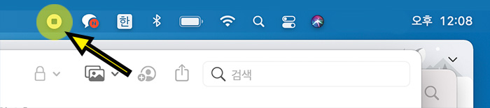 3. 맥북에서 화면 녹화를 중지하는 방법은 오른쪽 상단에 위치한 네모 아이콘을 선택하면 녹화는 정지되고 녹화 된 파일은 옵션에서 지정했던 데스크톱에 파일이 만들어집니다. (문서나 다른 위치로 설정했다면 그 위치에 생성됩니다)