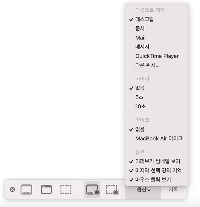 2. 바로 녹화를 해도 상관없지만 몇 가지의 화면 기록 옵션이 있으니 설정한 뒤에 녹화를 진행하는게 좋습니다. 옆의 옵션 버튼을 선택하면 먼저 저장위치를 고를 수 있고 (기본은 데스크탑) 녹화를 시작할 때 타이머 설정이 가능합니다.(기본으로 없음이기에 녹화가 바로 진행됩니다.) 또 마이크도 설정할 수 있는데 맥북의 마이크를 이용해서 외부에서 들리는 소리를 녹화하는 기능입니다. 마지막으로 마우스의 클릭을 보는 설정이나 썸네일등을 지정할 수 있습니다.