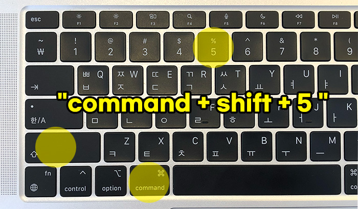 맥북에서 화면을 기록하거나 녹화하는 단축키는 "command + shift + 5 "입니다. 해당 키를 맥북에서 동시에 누르면 화면 녹화나 캡쳐하는 옵션이 하단의 독 위에 표시됩니다.