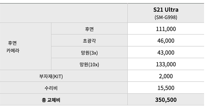 갤럭시 21 울트라 후면카메라 총 교체비용 : 350,500원